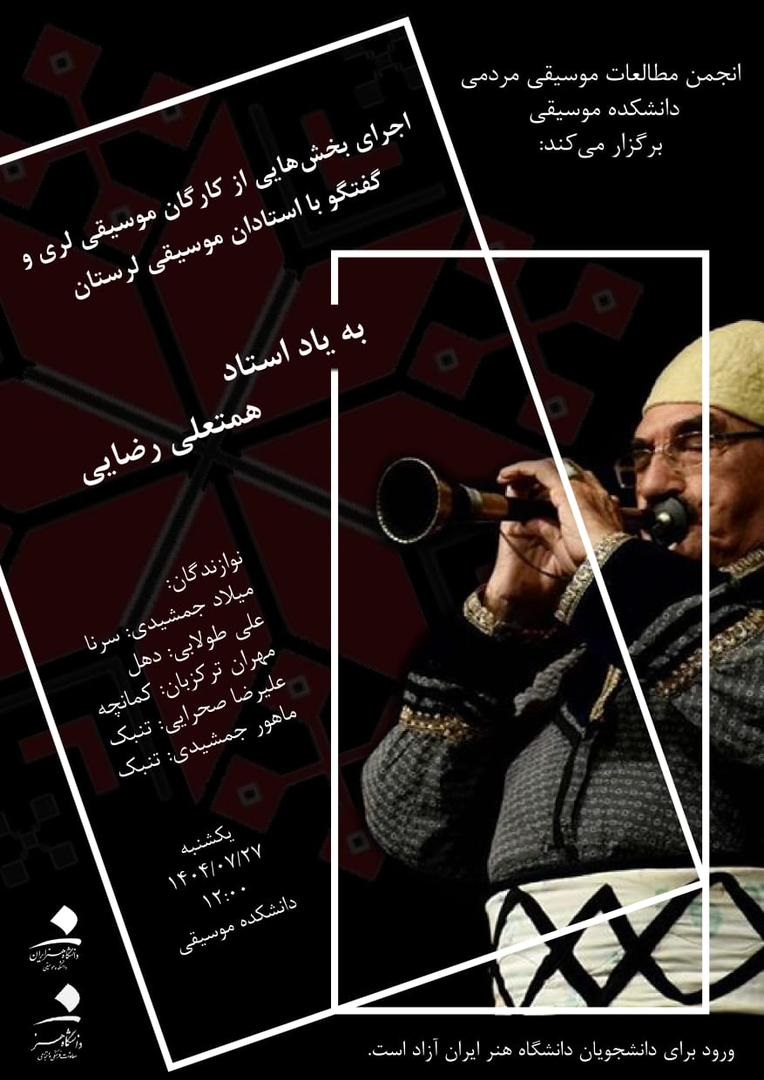 جاری مراسم گرامیداشت یاد استاد سرنانوازی لرستان، همتعلی رضایی که در مردادماه گذشته به رحمت ایزدی پیوست، در دانشکده مسیقی برگزار شد.